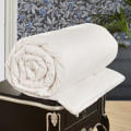 This lightweight cotton comforter with silk filling can solve the problem of night sweats once and for all. Silk fibers let the air freely pass through and facilitate quick evaporation of excess moisture. Besides, this comforter is exceptionally lightweight, hypoallergenic and hygienic. Unlike other comforters, it is not fluffy and will not give you a sensation of sleeping in the clouds. Instead, it will drape around your body, much like a sheet, only cozier. This silk comforter is great in all respects, but only if you are willing to handle it with care.